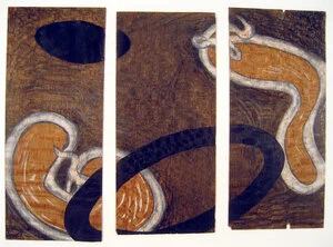My family traveled to the island of Aruba 14 years ago and while there we visited the only site of any archeological significance, a cave with pictographs from the now nearly extinct Arawak tribe. I have always been drawn to historical perspectives that are not well documented, like ethnic extinction, and I took pictures of the cave drawings. Many years later I dug up the pictures and was struck by the symbolism and beauty of these ancient images. Around the same time a friend gave me a large set of fine wood veneers. I immediately began to print lino-cuts of the Arawak signs onto the wood and added paint, wax, and glazes.